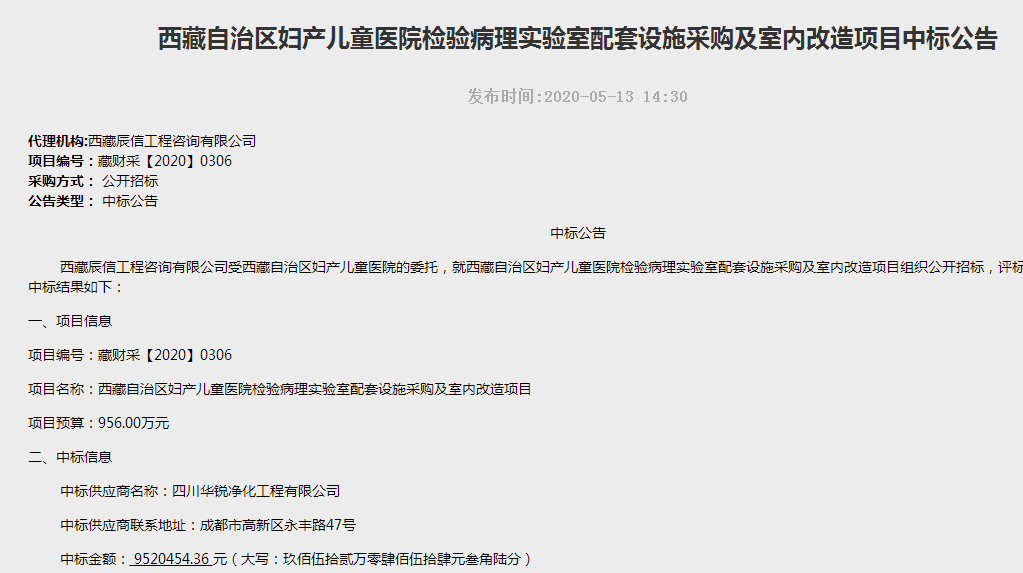 西藏自治區(qū)婦產(chǎn)兒童醫(yī)院檢驗病理實驗室配套設(shè)施采購及室內(nèi)改造項目中標(biāo)公告