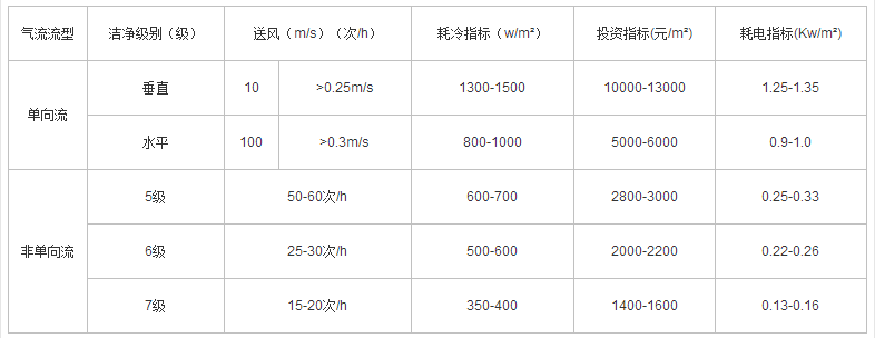注:表中的送風量、單向流以斷面風速表演示,非單向流以換氣次數(shù)表示。